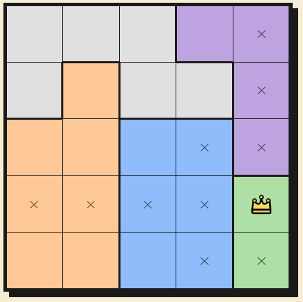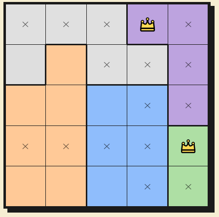 If you're a puzzle game fan, you've probably seen this game go viral on LinkedIn*! A queens puzzle (aka Star Battle) is a grid-based logic puzzle where you put queens onto a grid with colored subsections under strict rules. Each grid, regardless of size, has a unique solution, so players need to logically deduce where to place their queens.