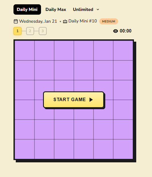 - Queens Daily Mini - A quick mode that brings 3 new puzzles every day, with each successive level upping the grid size and hardness. The overall difficulty also depends on what day it is in the week, with Monday being the easiest and Sunday the hardest. Solvable in 3-6 minutes, designed for brief game breaks.